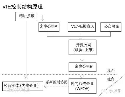 名詞解釋1:VIE結構——由外國投資者和中國創始股東成立一個離岸公司,再由離岸公司在中國境內設立一家外商獨資企業從事外商投資不受限制的行業的一種股權結構。↓