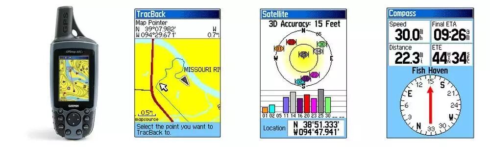 下圖就是 GPS 導航設備生產公司 Garmin 在 2004 年生產的設備 GPSMAP® 60Cx 便攜式導航儀。它是一種安裝了地圖、導航、雷達測速等相關專業導航功能的小手機,可以掛在車內作導航,也可以平時帶在身邊使用,續航可以達到 30 小時。