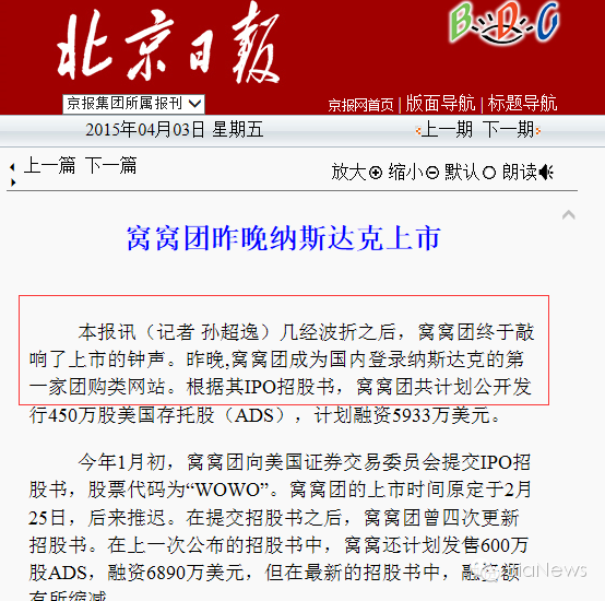 此次延后,還殃及紙媒,北京日報沒有料想到窩窩團上市未成功,“成功敲響納斯達克鐘聲”的稿件已刊出。