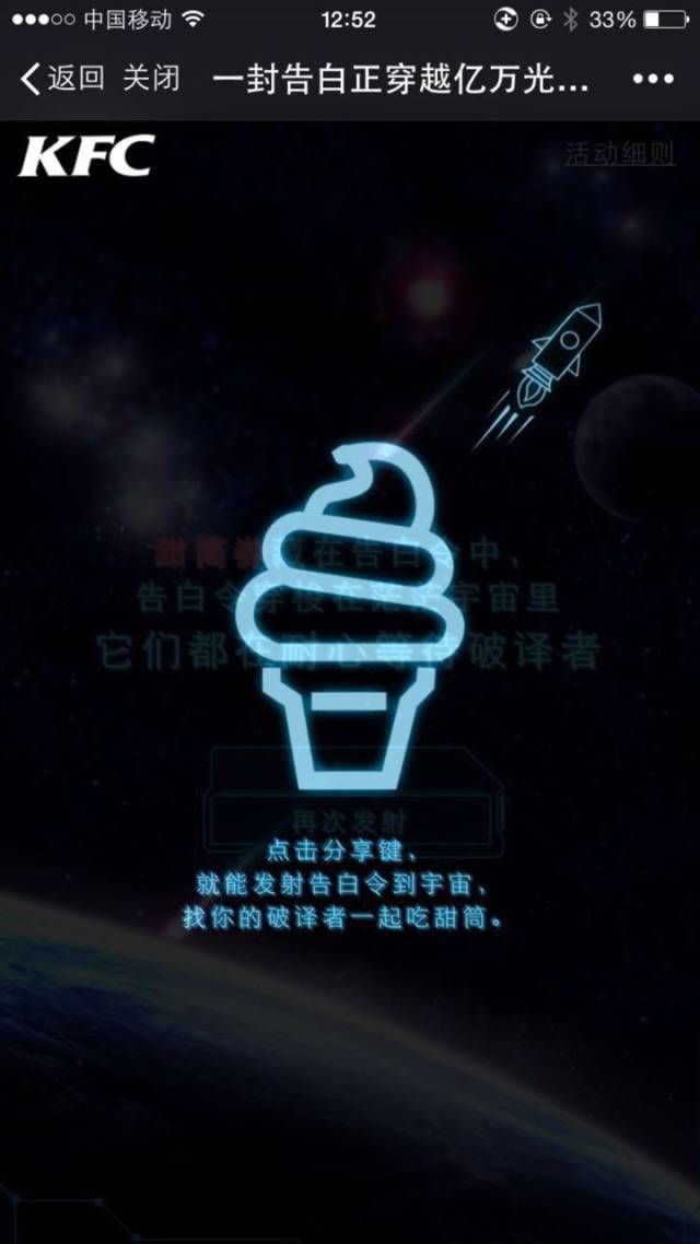 今年肯德基做了一個“七夕表白令”的活動頁面,可以發送自己的告白令分享給朋友,只要對方解密成功就都能得到一個肯德基的甜筒。給人一種眾里尋他千百度,那人就在身邊的感覺,符合七夕的節日氛圍。對于勇氣不足人又多了一個跟男女神表白機會,不成功借口說是為了拿冰淇淋,而有男女朋友的把自己想說的情話發給對方也是一個浪漫的事情。