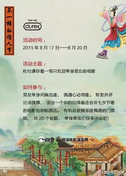 活動3:此前網上就曾流傳過單身去電影院買票隔開情侶的段子,但是杜蕾斯再和微票合作就七夕上映的電影《女神大作戰》,做一場只歡迎單身男女的活動。