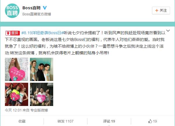 在七夕用帥哥美女是常用的方式,BOSS直聘請了這一堆的外國美女大吸眼球,除了這些模特外去找了例如訂房寶、熊貓自媒體聯盟等公司一起約起high微博發照,本來雖然算不上很好的創意,但起碼也是一個中規中矩的七夕活動,不過這條贈送模特貼身吊帶的活動,并且還進行了置頂讓整個活動一下就變得低俗了,這件事一下就low了。