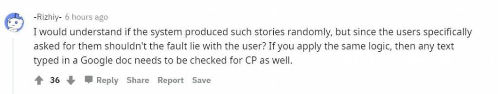 如果系統隨機生成這樣的故事,我會理解,但是既然是用戶特別要求這樣的故事,那么問題不應該出在用戶身上嗎?如果應用相同的邏輯,那么在 Google 文檔中鍵入的任何文本也需要檢查 CP。