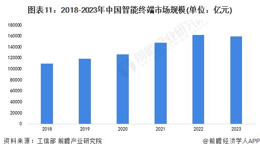 經過多年的發展我國智能終端產業已經成為了一個超過 15 萬億人民幣市場規模的巨大產業,但受近兩年宏觀經濟和需求下行等影響,行業增速有所放緩進入調整期。根據前瞻初步核算,2023 年中國智能終端市場規模將達 158981.8 億元,同比下滑 1.63%。