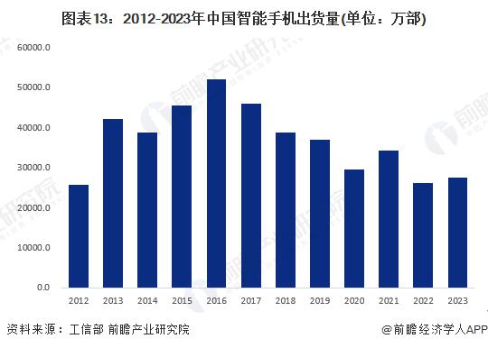 2012-2023 年中國智能手機出貨量整體呈波動下降的趨勢,2021-2022 年開始智能手機出貨量連續兩年出現下降,2023 年出貨量回升至 2.76 億部,同比增長 4.5%,但仍處于低位。