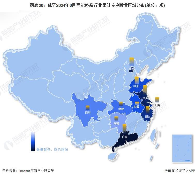 企業數量區域分布方面,我國智能終端企業區域分布呈從東部沿海向內陸地區省份逐漸減少的態勢,主要分布在廣東省、江蘇省和浙江省。