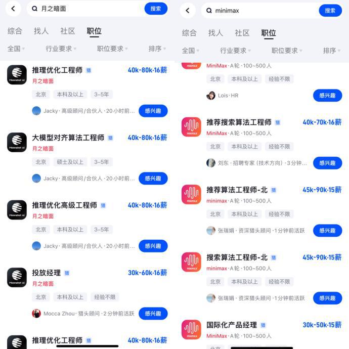 招聘信息顯示,AI 六小虎中重押 AI 搜索推理方向的是月暗,大量涉及推理和工程優化方向的崗位顯示在招。功能上,越來越像 Perplexity。Minimax 同時也在招聘搜索推薦相關的工程師,但思路有所差異,聚焦在旗下 AI 應用里的算法、廣告投放優化。
