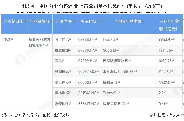 目前,商業(yè)智能上市企業(yè)數(shù)量較少,代表性企業(yè)包括:百度集團(tuán)、網(wǎng)易、浪潮信息,具體情況如下: