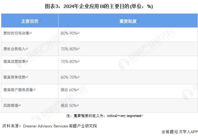 更好的決策引導、增加收入、提高運營效率和提高競爭優勢成為企業應用 BI 的四大主要目的。除此之外,其他目標還包括:提高客戶服務質量、實現更高程度的合規和風險管理。